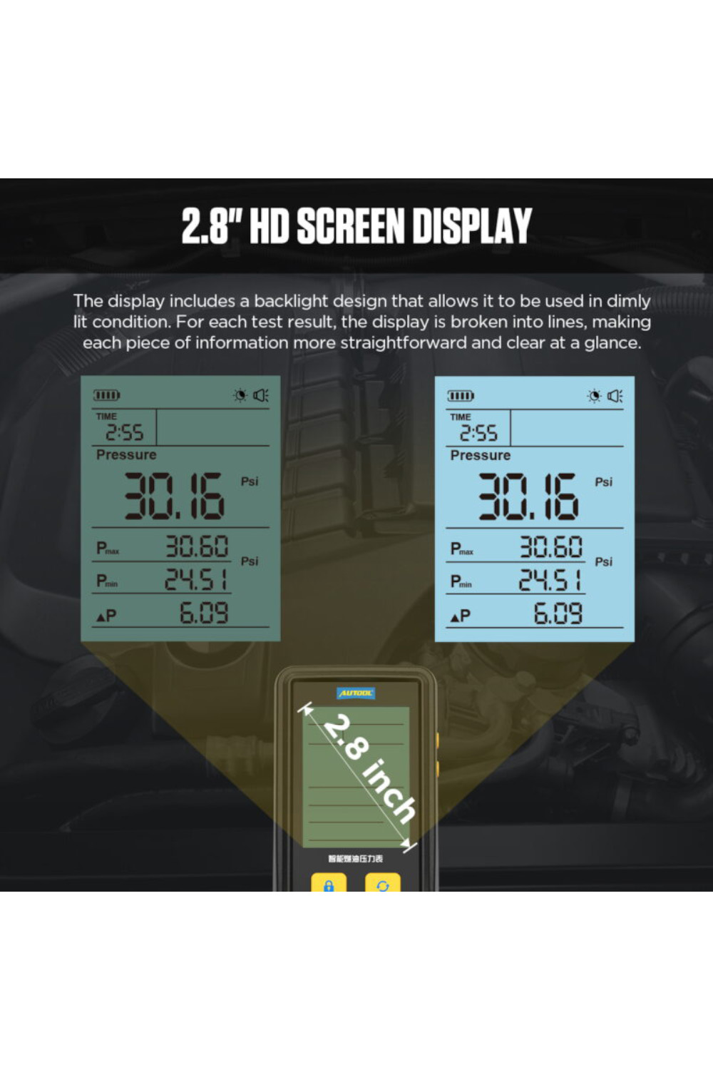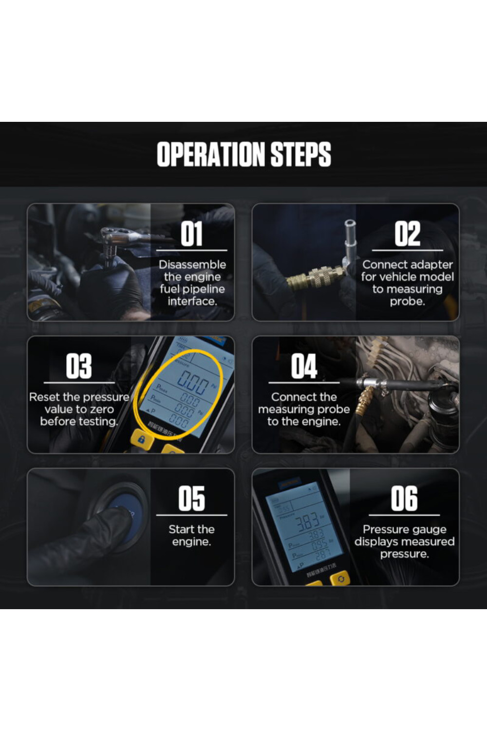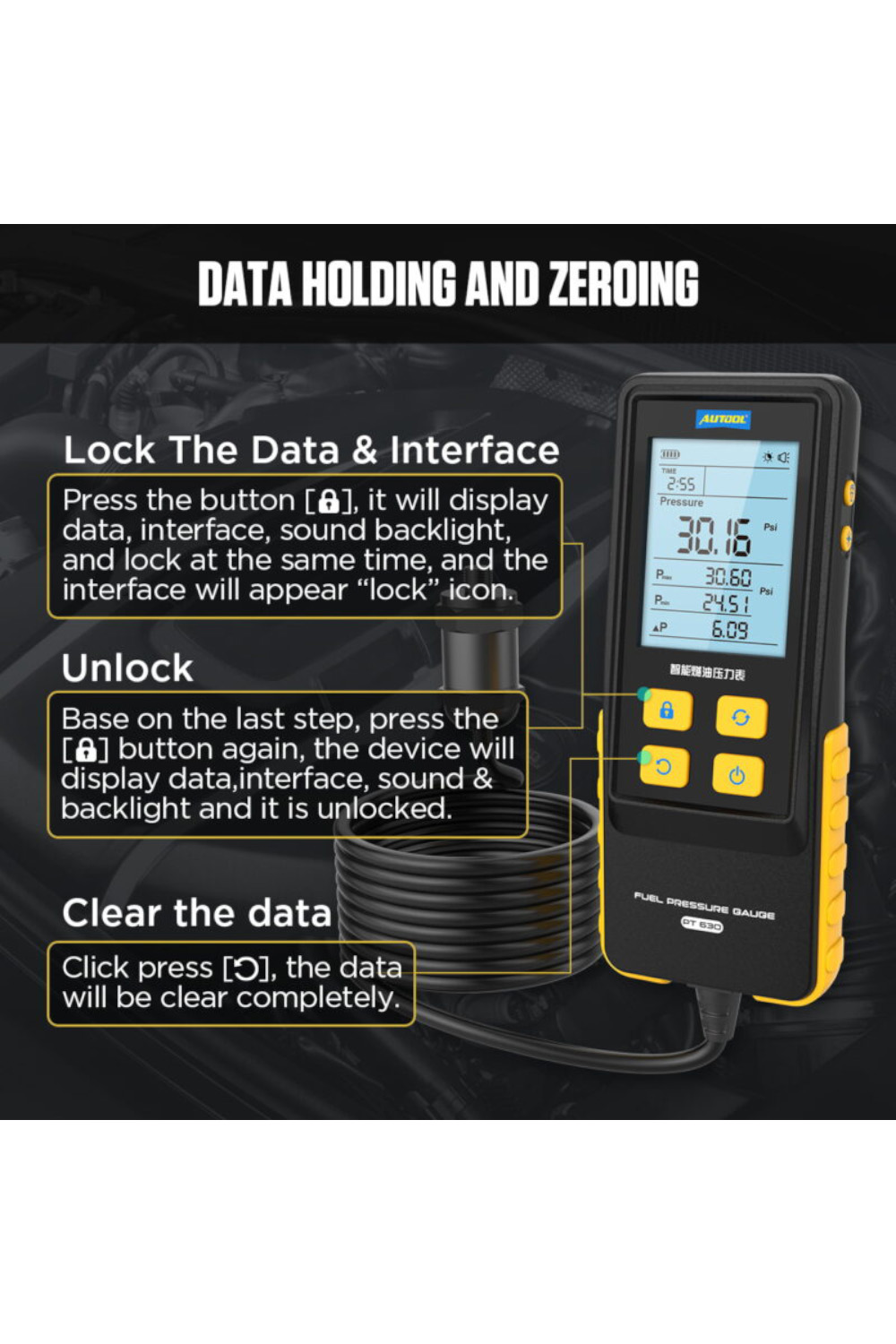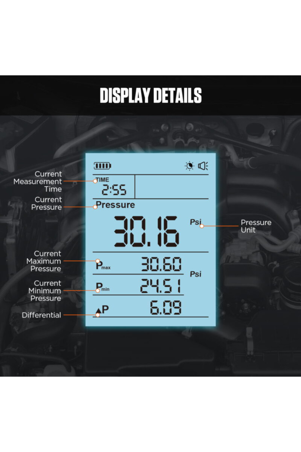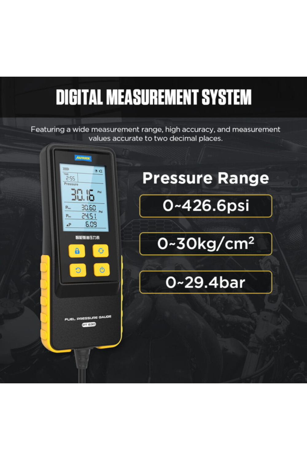 Opseg merenja je od 0 do 30 bar-a, a uređaj prikazuje pritisak goriva u realnom vremenu, vreme merenja, minimalnu i maksimalnu vrednost, kao i njihovu razliku, a intuitivni prikaz čini detekciju pritiska goriva lakim i jednostavnim.