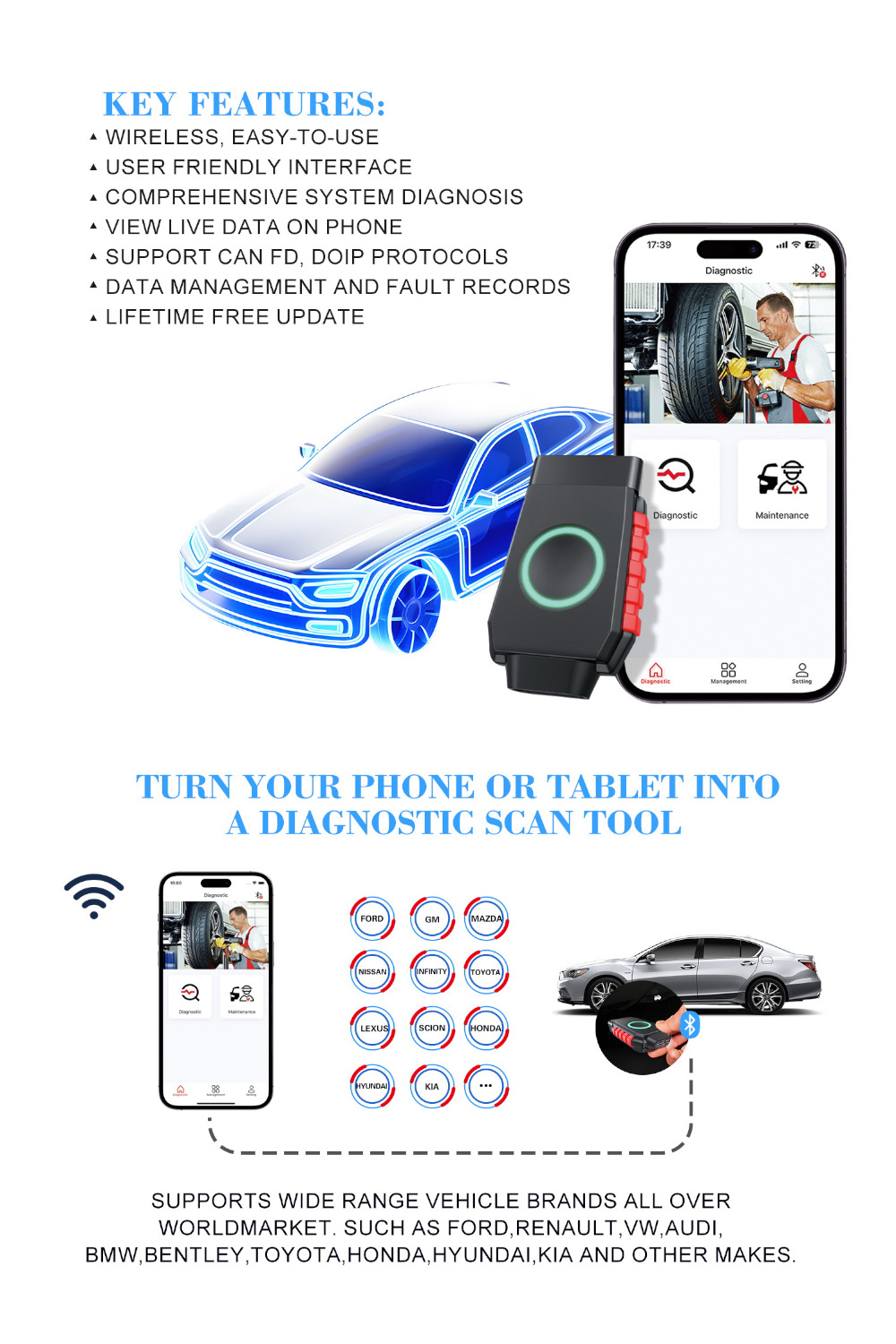 - Podržani protokoli: ISO15765, ISO14230(KWP2000), ISO9141-2, J1850VPW, J1850PWM, KWP1281, KWP2089, KW81, KW82, ALDL, SCI, DSI, DSII, LUCAS, MELCO, BENIX, ISO7800, SIMENMS_ISO1, SIMENMS_ISO2, CAN FD, DoIP;