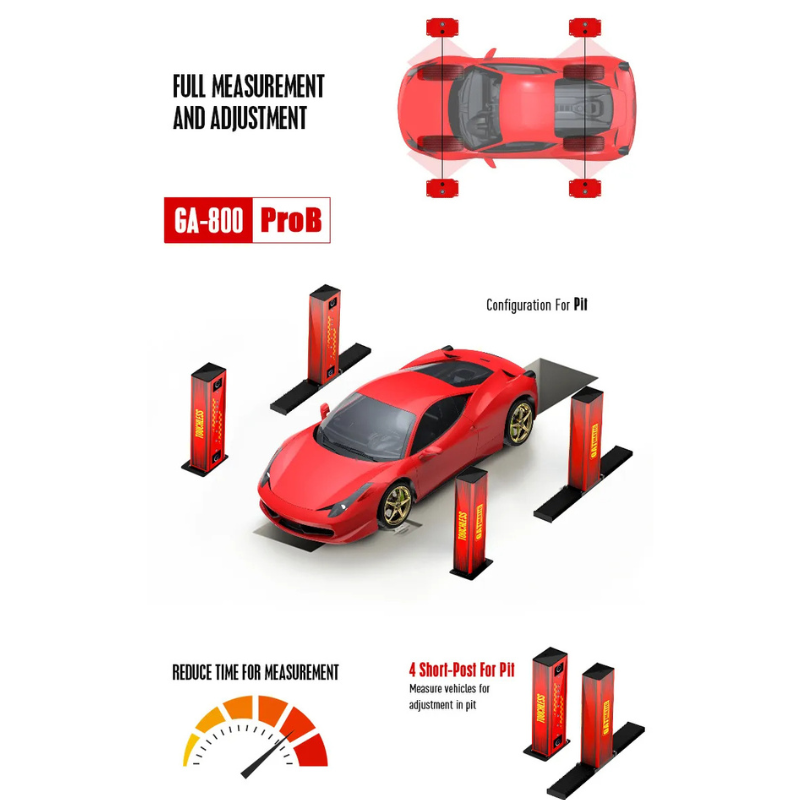 GA-800 ProB beskontaktni uređaj za merenje geometrije točkova opremljen je moćnim sistemom kamera koji koristi kamere visoke rezolucije, senzore i 3D prikaz za brzo snimanje sva četiri točka.