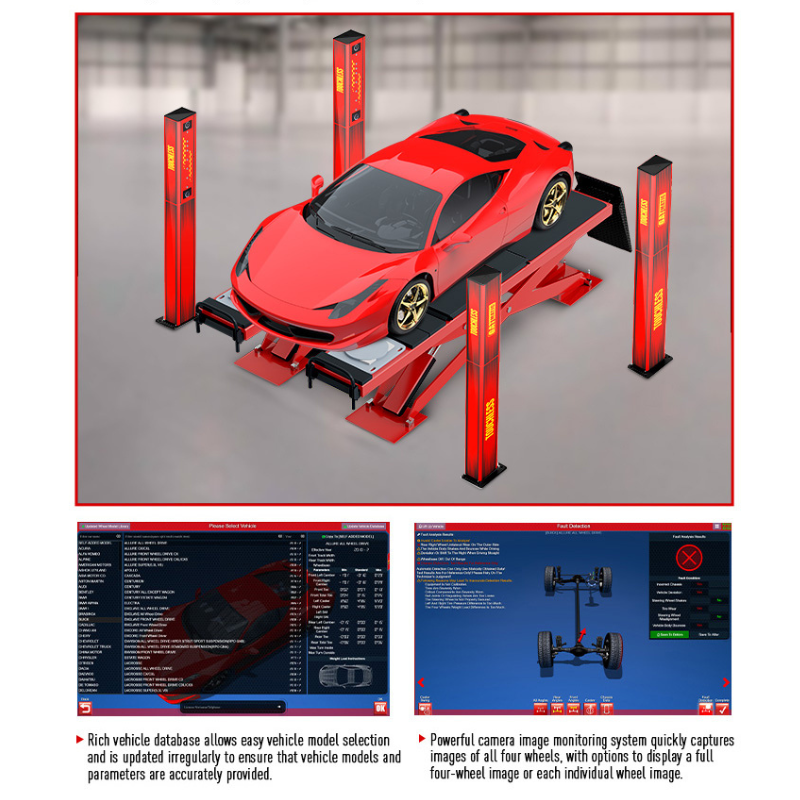 Za razliku od tradicionalnih metoda koje zahtevaju mehanička podešavanja, ovaj savremeni beskontaktni sistem za merenje geometrije prikuplja podatke u realnom vremenu skeniranjem točkova i šasije, obezbeđujući preciznu kalibraciju uglova nagiba (camber), zaturanja (toe) i uzdužnog nagiba osovine (caster). Bez upotrebe stezaljki i meta, sistem značajno smanjuje rizik od oštećenja pneumatika i dodatno unapređuje sigurnost i efikasnost rada.